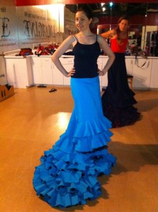 Yesterday was my first experience with the bata de cola (that blue thing I’m wearing in the photo). Beautiful, yes, but this little ruffled monster isn’t easy to maneuver. I thought the mantón was a beast, but damn … the bata presents a completely different set of challenges.